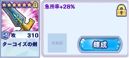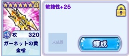 攻撃力280〜320 追加効果は下記から1つ クリティカル率+31・32% 急所率+31・32% 敏捷性+26・27 | ||